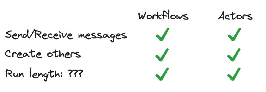 It’s initially unintuitive to use something called a “workflow” to build things called “actors.” The term workflow, in the most general sense, means a sequence of steps that takes work from an initial state to a final state. By contrast, Actors can and do cease to exist at some point, but they generally stick around so that they can continue to receive, reply to, and send messages.