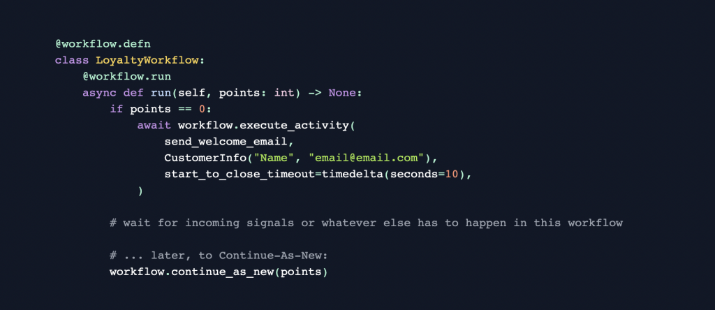Consider a Workflow-as-Actor that’s keeping track of a customer’s loyalty points. A fresh invocation of this function would have the loyalty points at zero: a brand-new customer hasn’t taken any action to earn points. But a long-time customer would be quite angry if their points periodically reset to zero and they lost their Gold status.