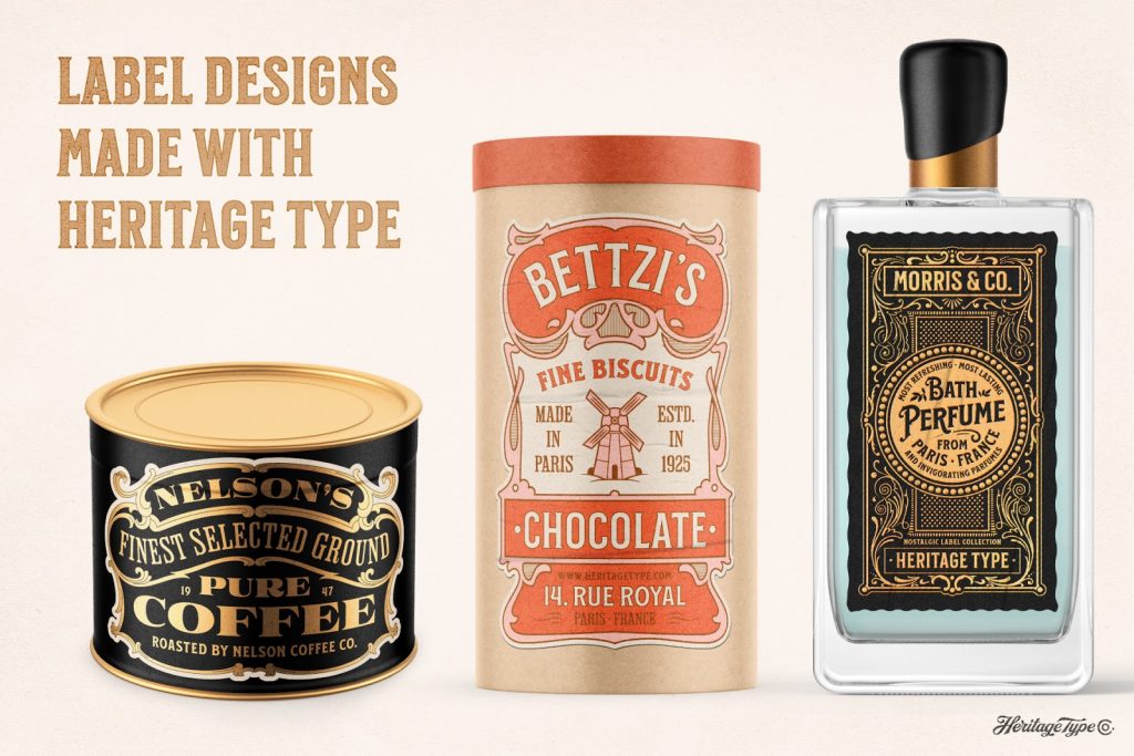Various product labels created with Heritage Type