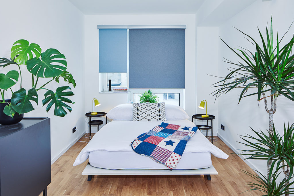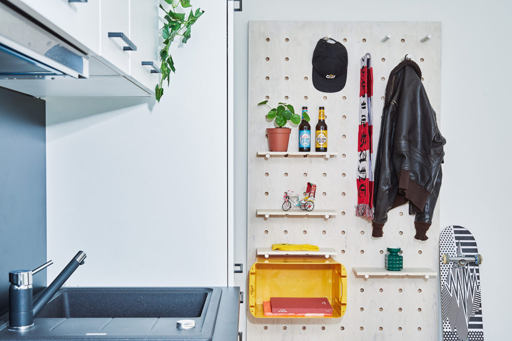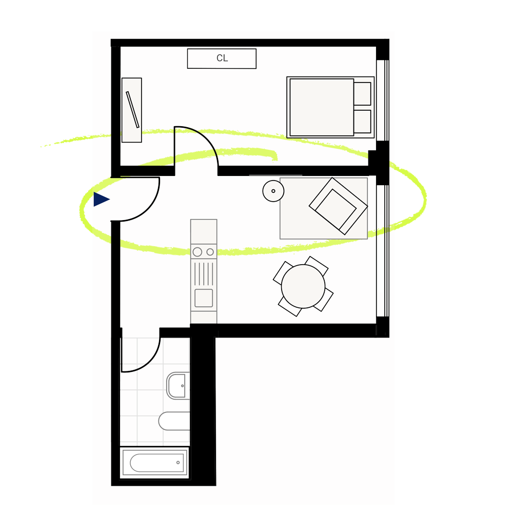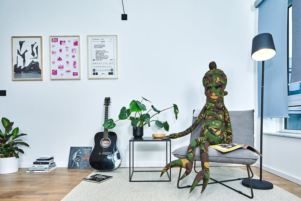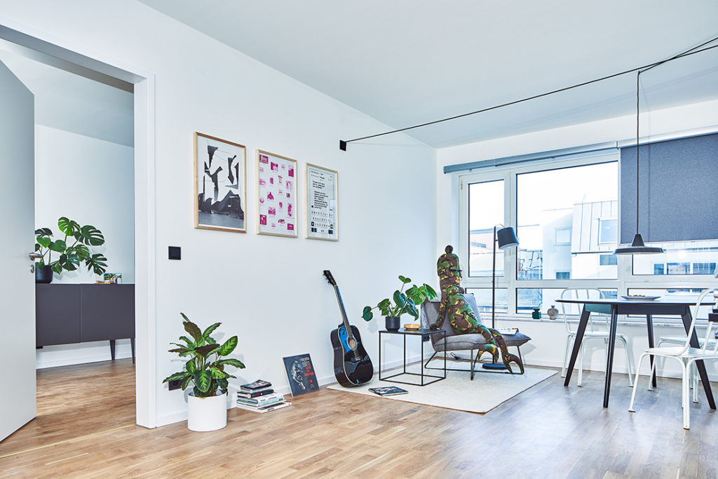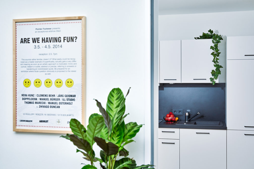 A one-bedroom, 42 square meter, courtyard-facing apartment on the 5th floor. Artwork by Clemens Behr, Zhivago Duncan and Ill-Studio