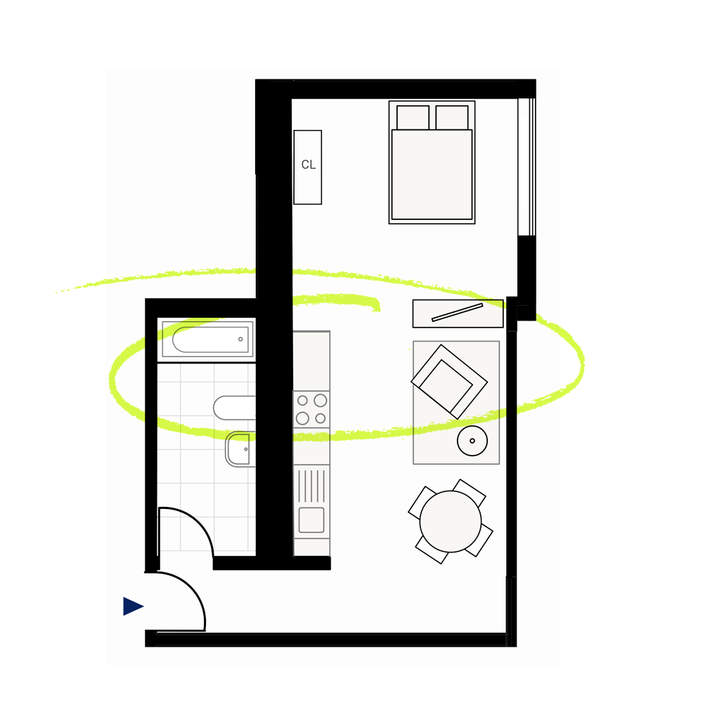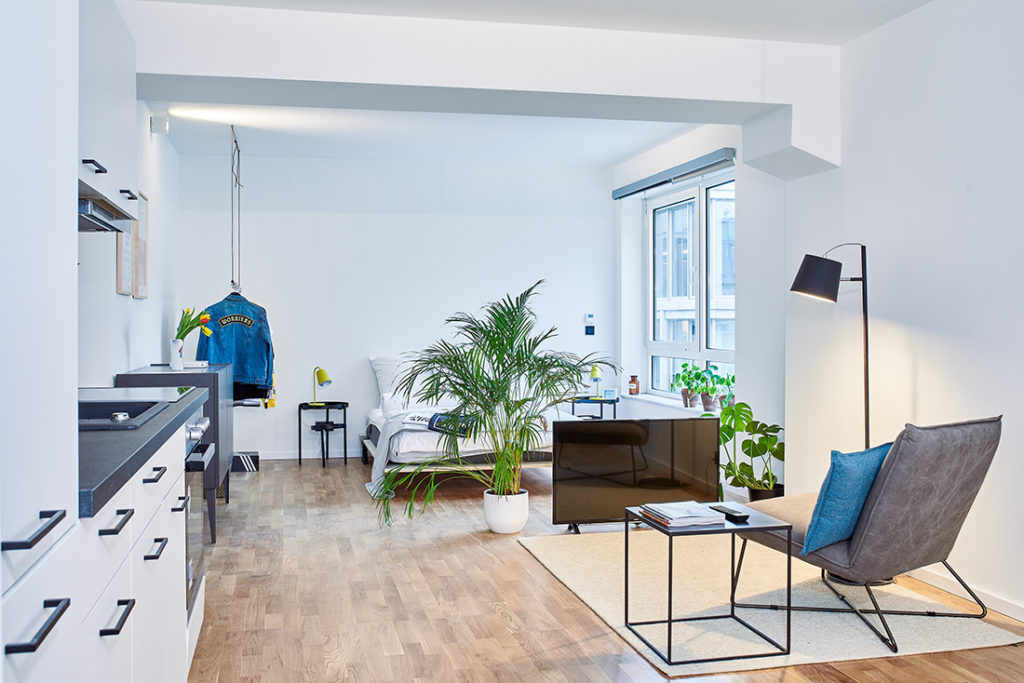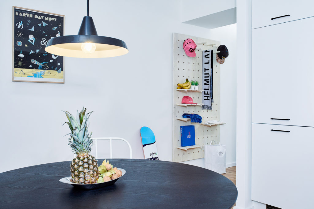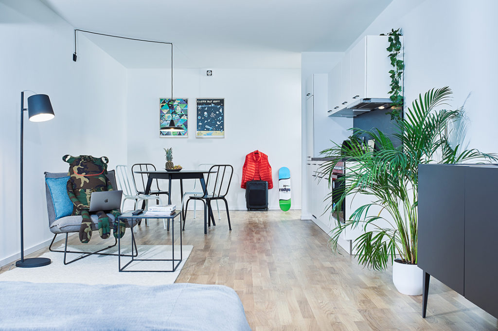 A 42 square meter courtyard-facing studio apartment on the 5th floor. Artwork by Steven Harrington, Thomas Marecki & Manuel Osterholt