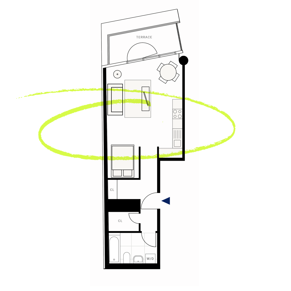 A 49 square meter, West-facing studio apartment on the 5th floor with a balcony and view over Chausseestrasse. Artwork by EyeEm