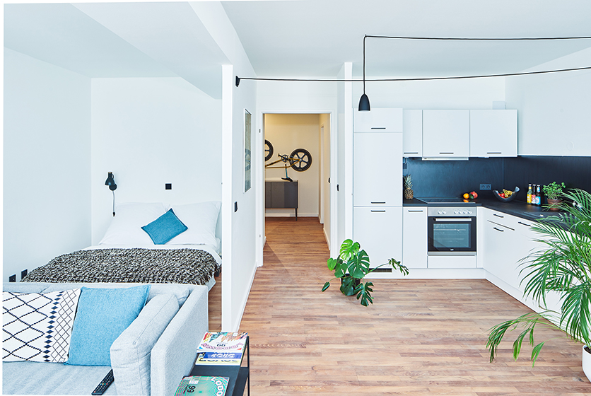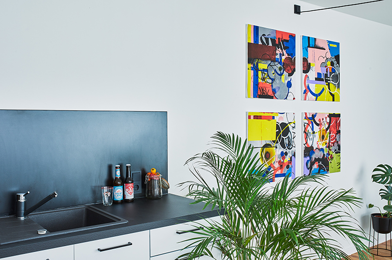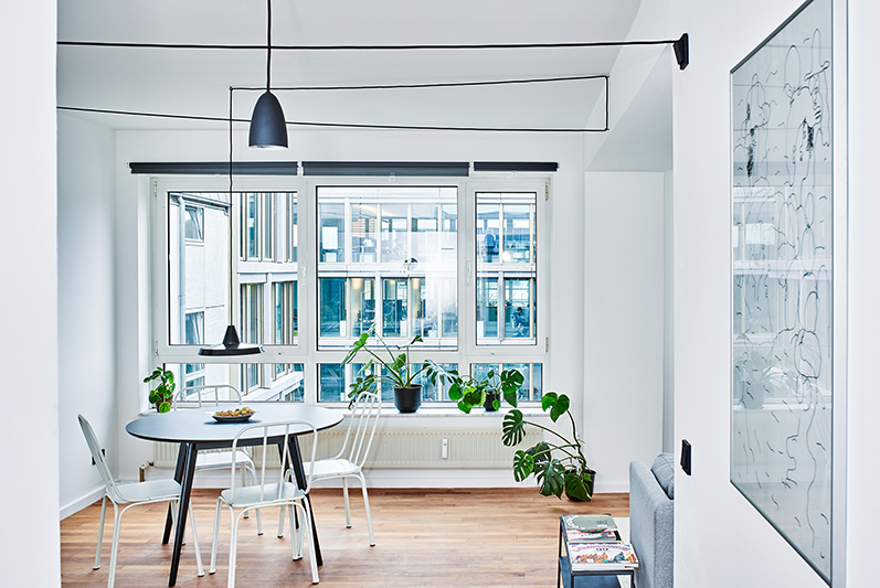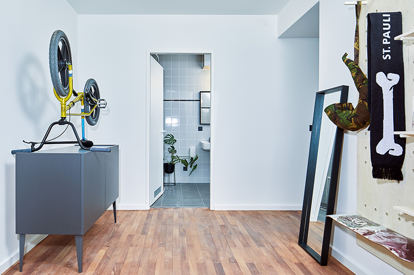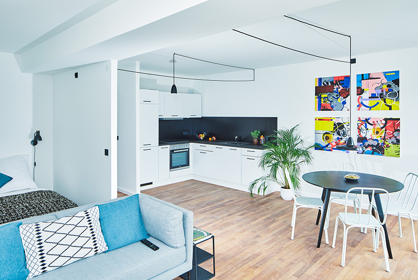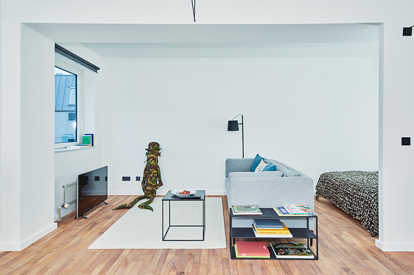 A 56 square meter courtyard-facing one-bedroom apartment on the 5th floor with artwork by Stefan Marx and Thomas Marecki / Marok