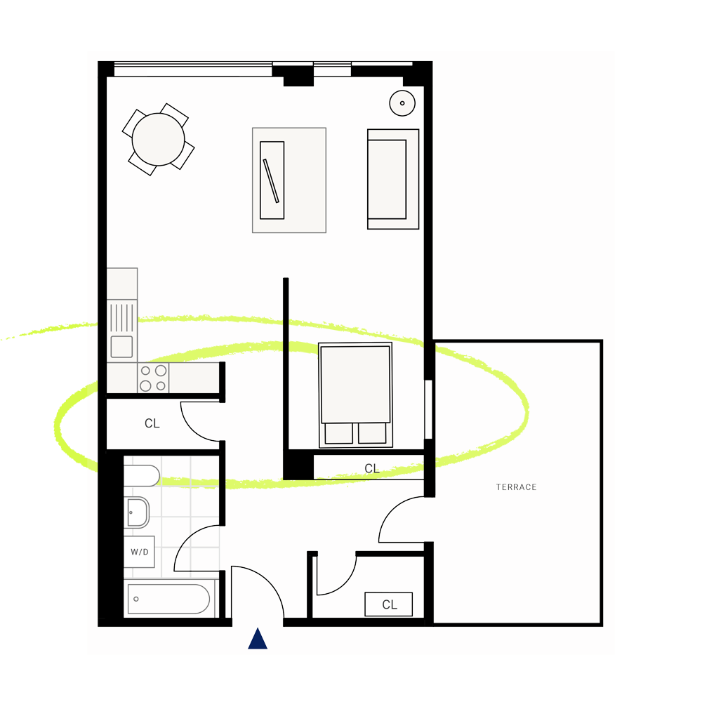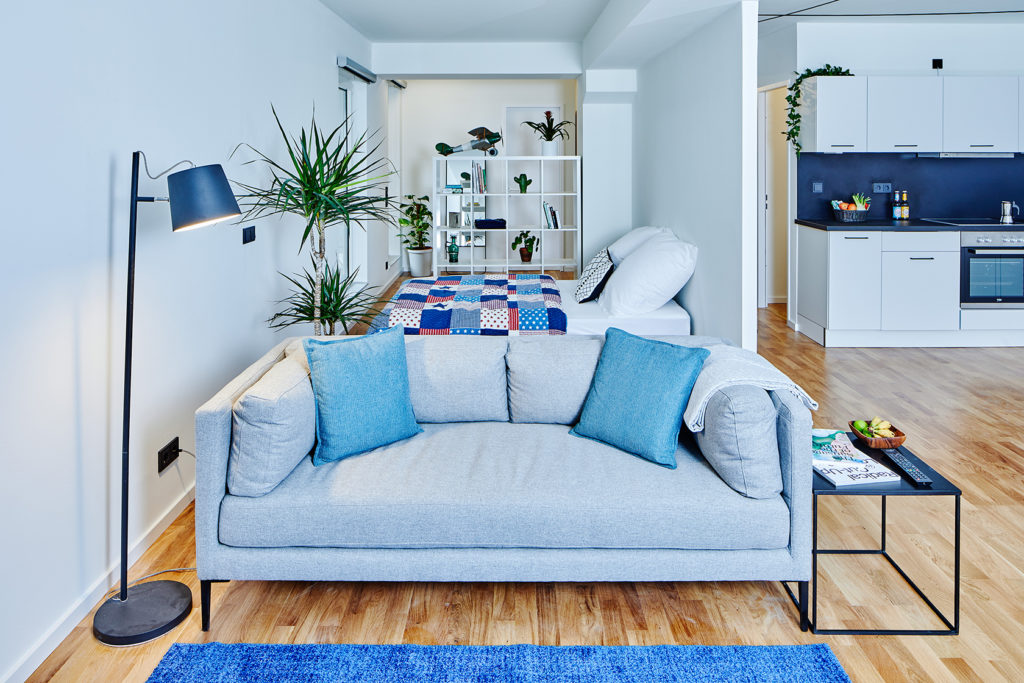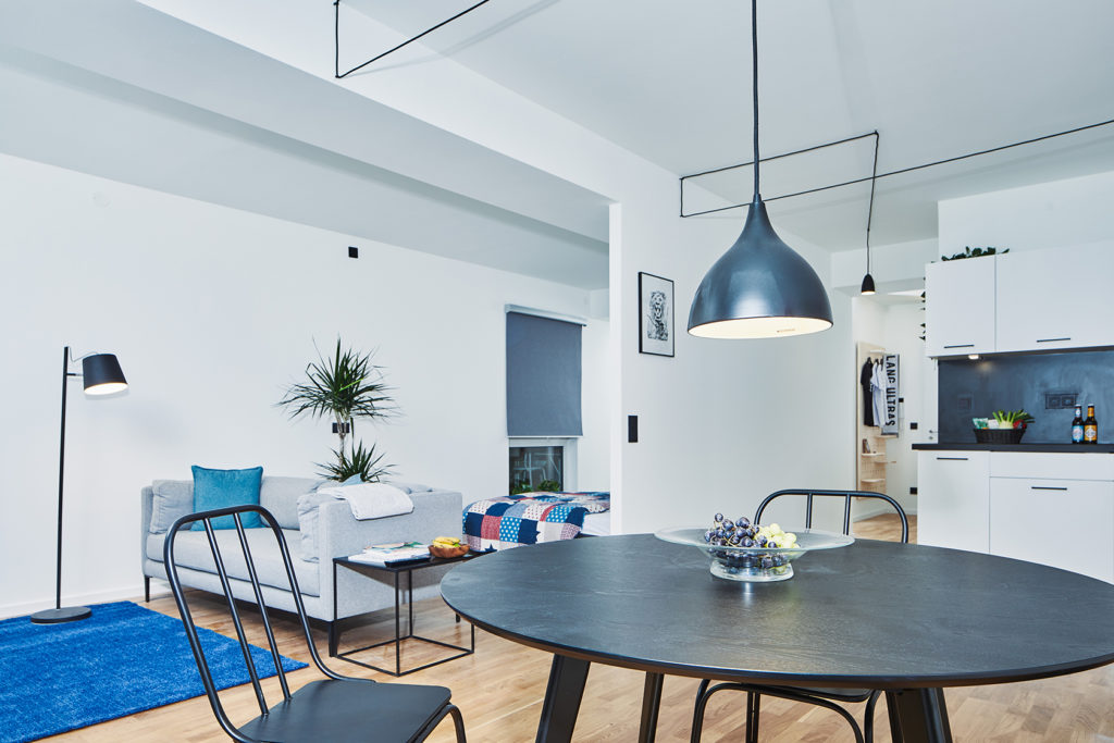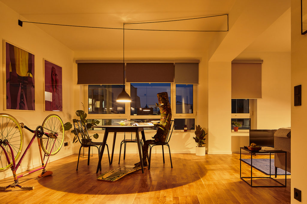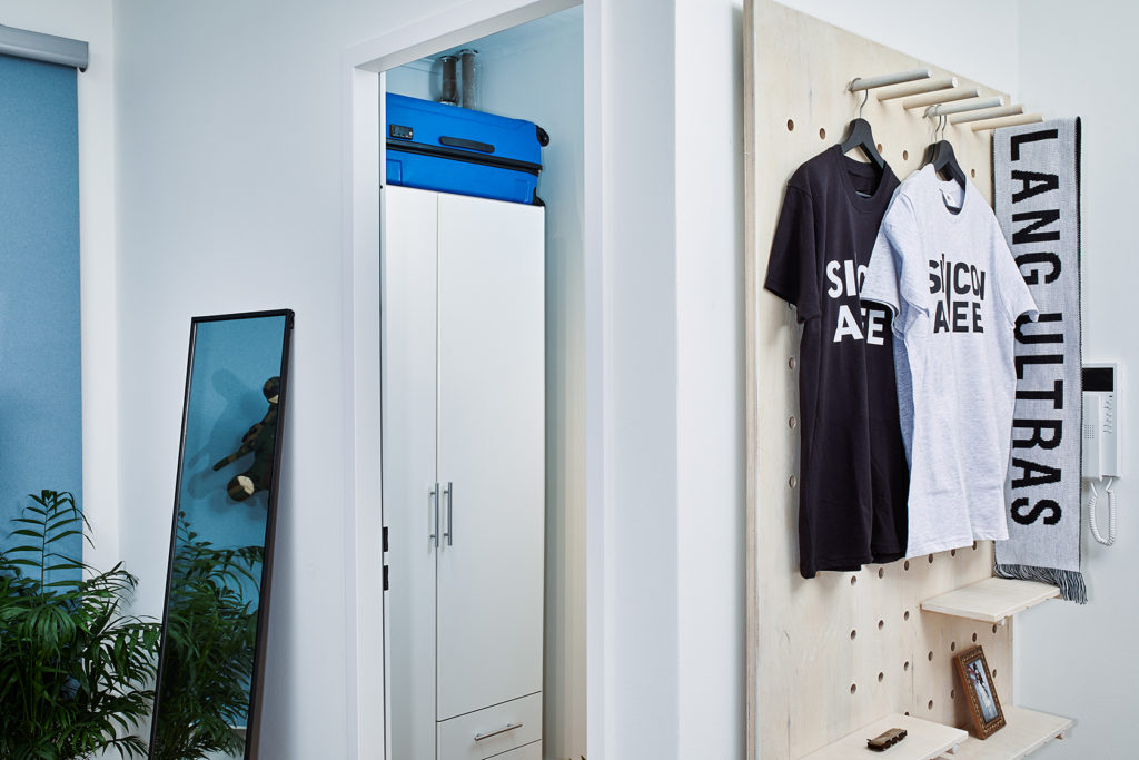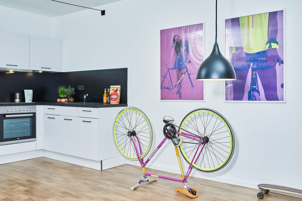 A 64 square meter courtyard-facing one-bedroom apartment with an East-facing terrace on the 5th floor. Artwork by Alexander Flach and Manuel Osterholt